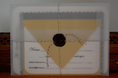 our inner envelopes were all tied up with twine and wax. i used a hot glue wax on some invites, and a real sealing wax on others. (the hot glue wax is pictured here.)